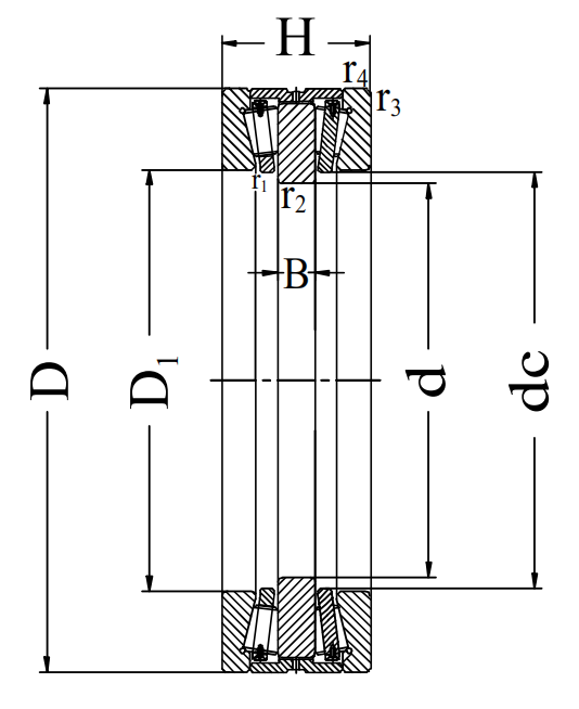 推力圓錐滾子軸承與四點(diǎn)角接觸球軸承的結(jié)構(gòu)相似同樣有雙半內(nèi)圈整體外圈及雙半外圈整體內(nèi)圈的結(jié)構(gòu),但不可分離。能承受較大的徑向負(fù)荷為主的徑向和軸向聯(lián)合負(fù)荷和力矩負(fù)荷,限制軸的兩方面的軸向位移。主要用于限制軸和外殼雙向軸向位移,雖然軸承可承受雙向軸向載荷,但若一側(cè)有裝球缺口時(shí),則應(yīng)注意不要讓主要軸向載荷通過有缺口的一側(cè)溝邊。在軸承使用時(shí)應(yīng)注意使不帶裝球缺口的一側(cè)滾道承受主要載荷。